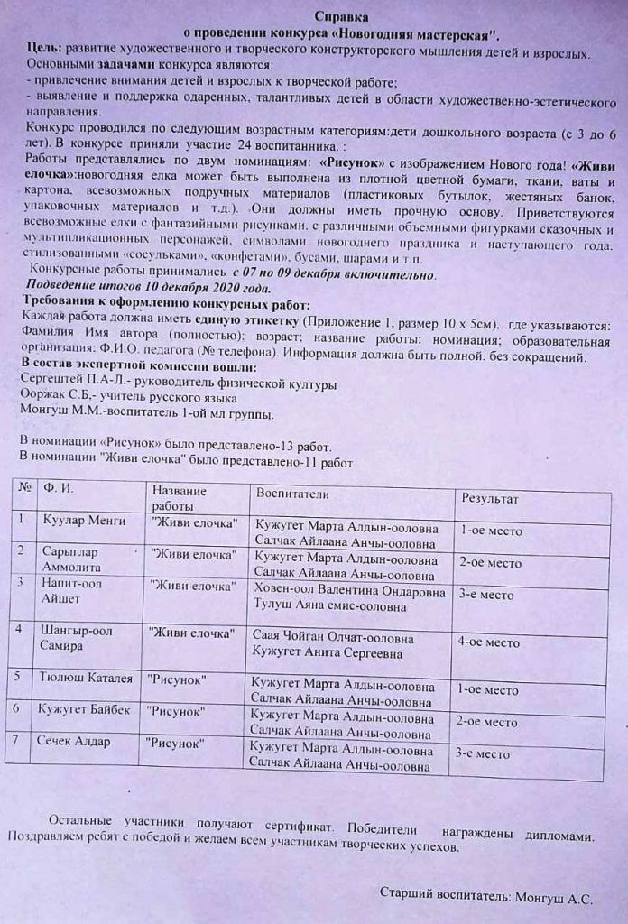 24 февраля 2021 г было проведено кожуунное соревнование по национальной борьбе «Хуреш» среди воспитанников ДОУ Барун-Хемчикского кожууна с целью пропаганды здорового образа жизни среди воспитанников ДОУ. Воспитанники МБДОУ д/с»Салгал» с Барлык заняли l и ll места. Среди детей: 4-5 лет — Кужугет Айнур Тойнурович — II место, 6-7 лет — Сергештей Аянчы Арсенович — I место.