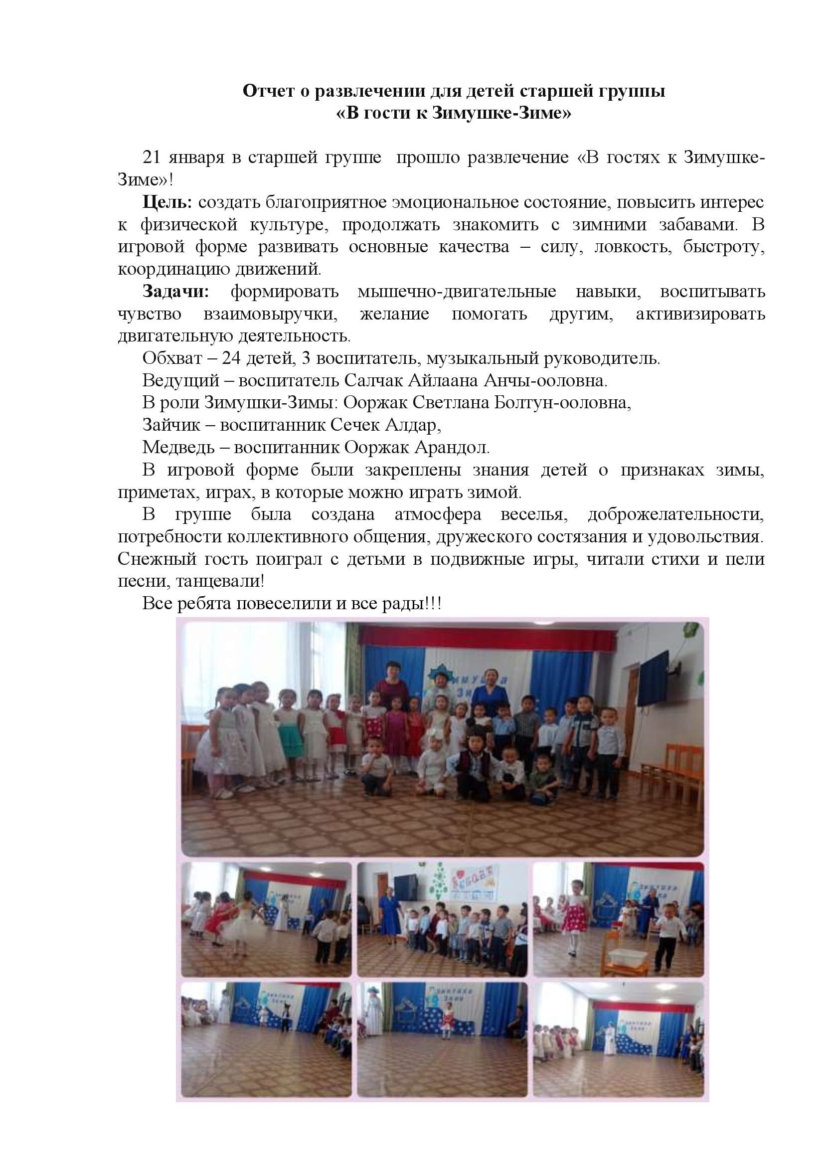 В рамках реализации тематической недели «Здравствуй, зимушка зима» в МБДОУ д/с «Салгал» были проведены мероприятия, в ходе которых у детей формировались обобщенные представления о зиме, как о времени года. Дети проявили свое творчество и фантазию в конкурсе рисунков «Зима». В группах проводились познавательные беседы на темы:»Зима», «Зимние забавы». Провели весёлые развлечения «Здравствуй, Зимушка зима!».