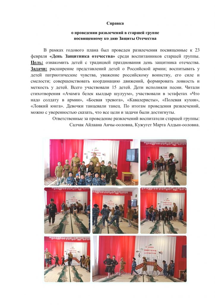 В МБДОУ д/с «Салгал» с Барлык 19 февраля был проведён спортивный праздник, посвященный 23 февраля «Бравые солдаты» в подготовительной к школе группе (18 человек). Цель и задачи: формировать основы здорового образа жизни:развивать физические качества:создавать атмосферу доброжелательности, дружеского состязания и веселья. Воспитывать у детей чувство уважения к Российской армии, любви к своей отчизне.